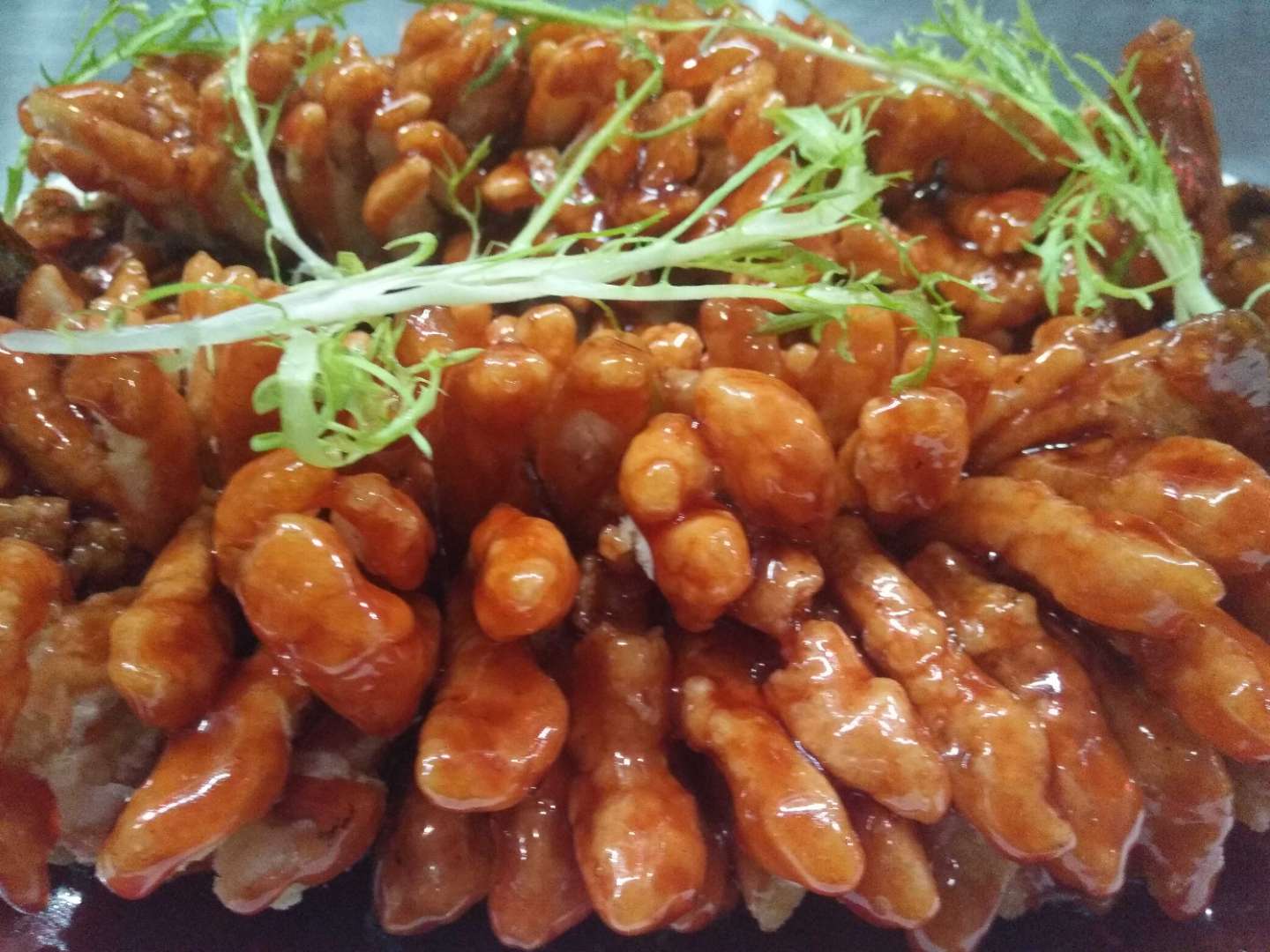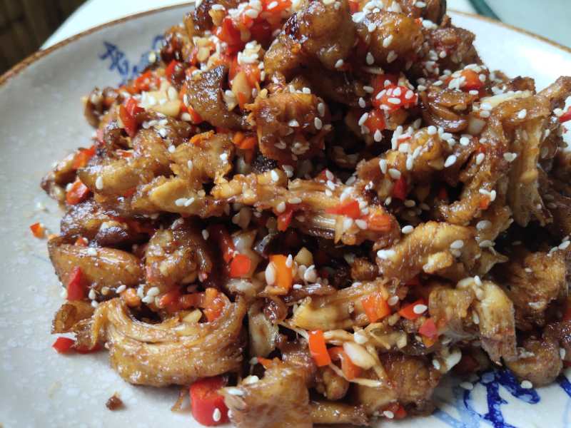 手撕雞炒制的非常入味,肉質(zhì)細(xì)膩且富有彈性,肥瘦剛剛好,一口咬下去油花滋飛,剛碰到牙齒,滿嘴都是雞肉的香味,微微嗆喉的辣椒給味蕾帶來了另一番滋味,一切都恰到好處。熱辣的醬汁淌過舌頭直達(dá)喉嚨,勁道十足的雞肉在舌尖也留有余香,就連骨頭嚼起來也很有滋味。