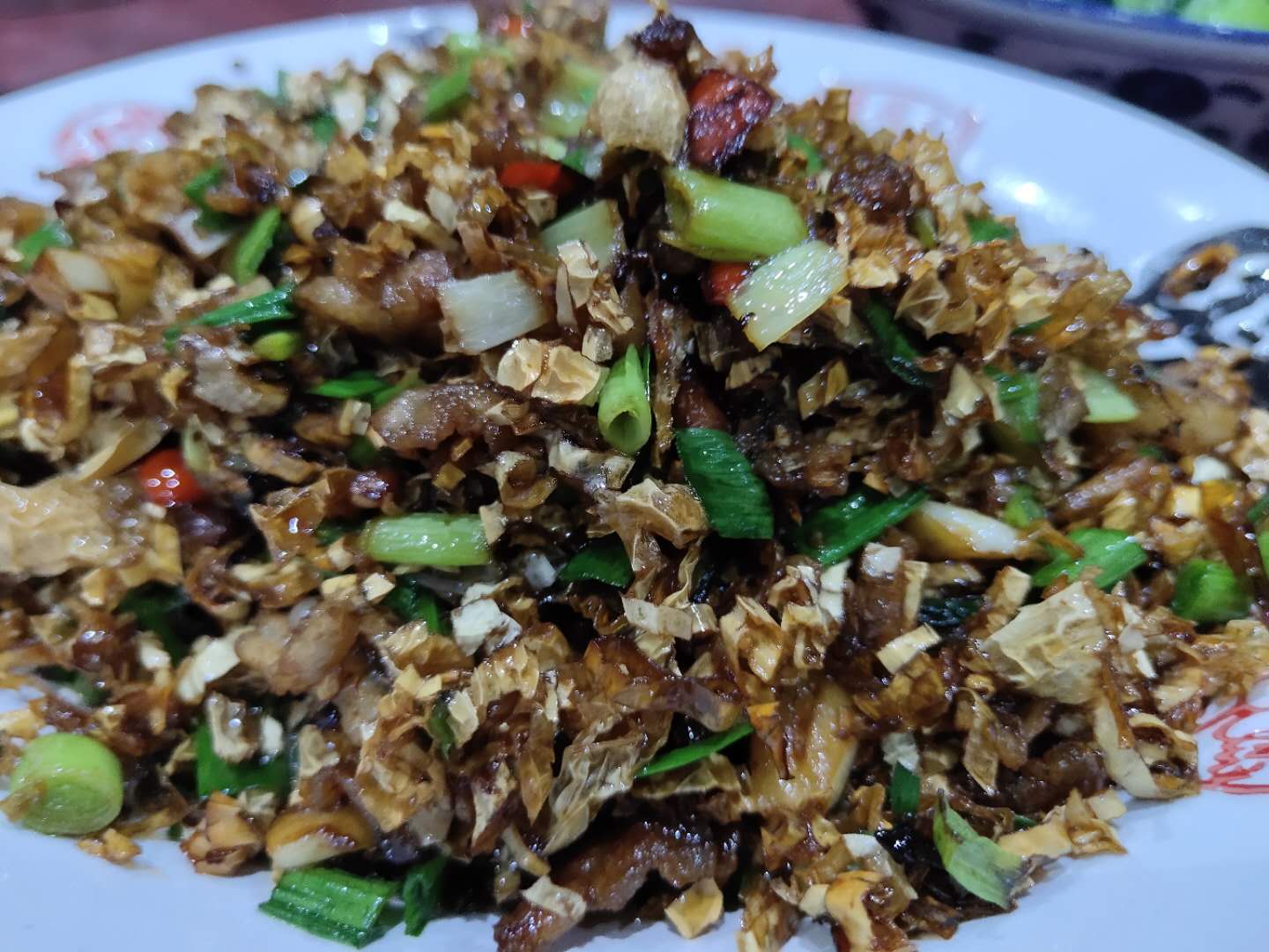 簡單的原材料卻碰撞出令人驚喜的味道。大火干煸后的肉帶著一絲焦酥,內(nèi)里松軟可口,味辣而不干,拌炒后的白椒浸透入味,三分辣五分油還有兩分香,豬肉與白椒互相入味滲透,肉味中染上白椒的蔬香,而白椒更是吸足了豬肉的油香,拌米飯而食,更是絕味。